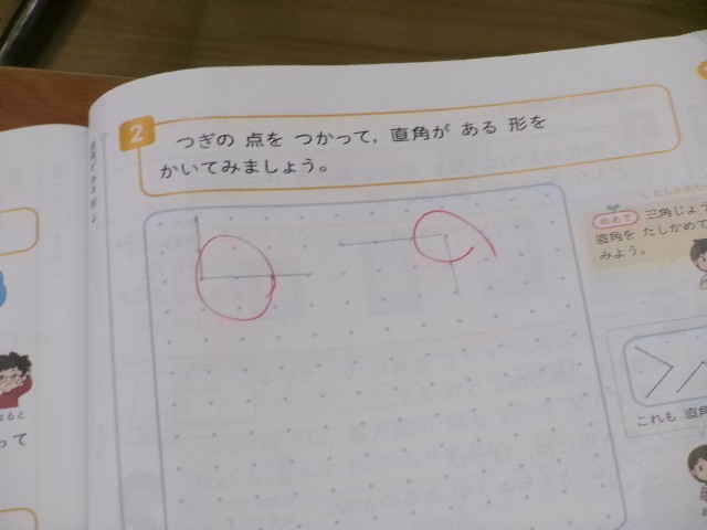 そして、その三角定規を使って、教科書のドット(点)をつなぎ、直角を描いてみました。