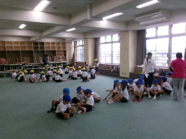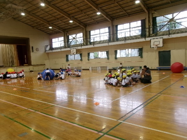 雨天のため、3校時目は体育館、4校時目は多目的ホールで活動です。