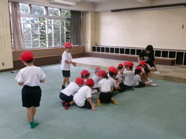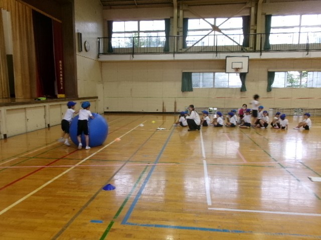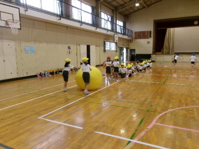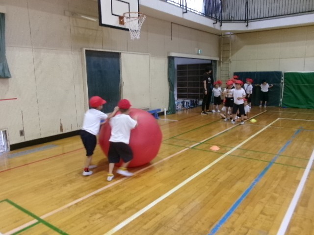 多目的ホールでは、大玉転がしとセットで行うピサ運びについて、どんな具があるといいか、話し合い。