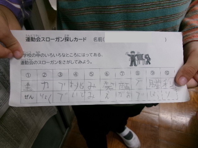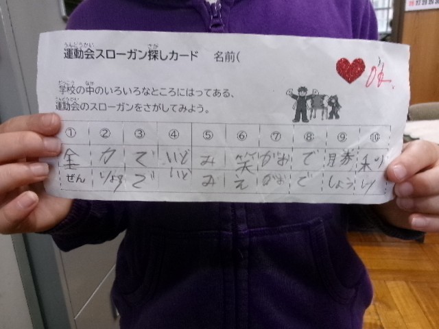 「運動会スローガン探しカード」を持って、休み時間、学校内をみんなで探し回りました。