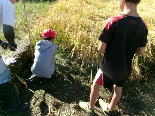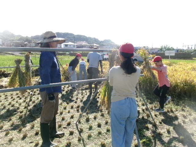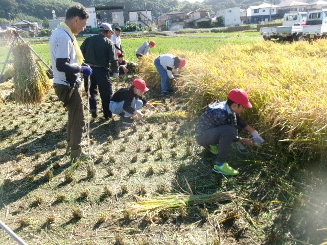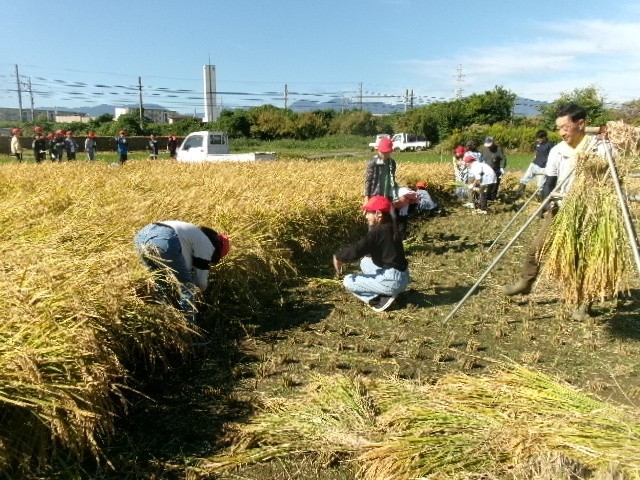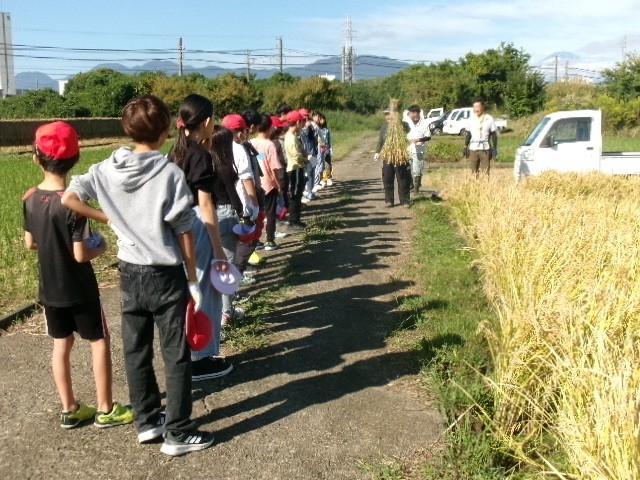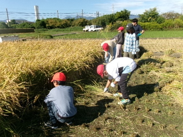 6日(月)、1組から3組まで1クラスずつ、少し時間をずらしながら稲刈り体験をさせていただきました。