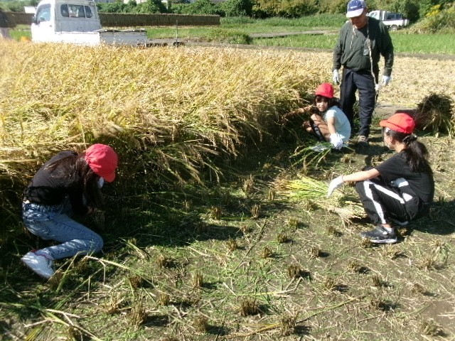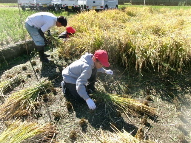 まずは、稲の刈り方、束ね方、干し方を教わりました。