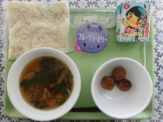 きのこうどん 肉団子のケチャップ餡 ブルーベリーゼリー 牛乳