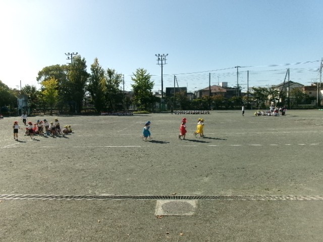 大玉を転がし終わった子は、お面に付けたピッツァの具をグラウンドの真ん中にあるピッツァに付けていきます。(この時、ピッツァの周りで踊っているので、そちらもご覧ください。)