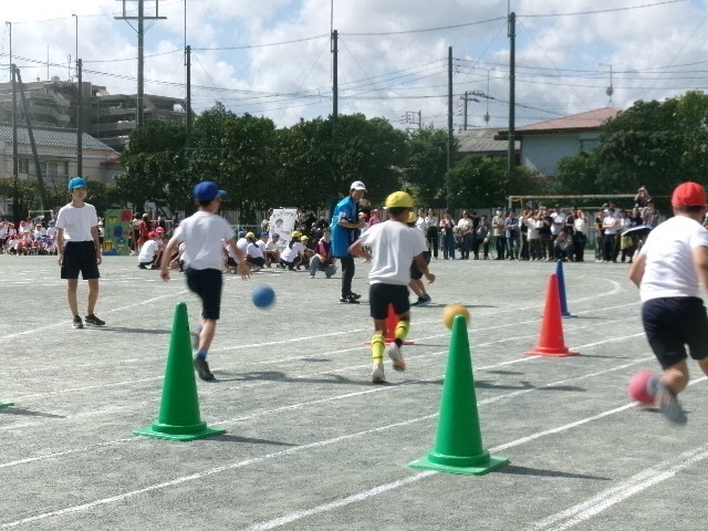 ジグザクドリブル、ミニハードル、おたまにピンポン玉、ネットくぐり…いくつもの障害を乗り越えていきます。