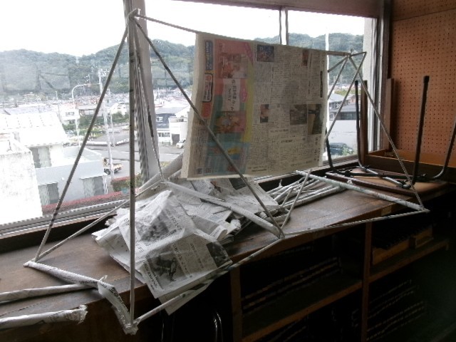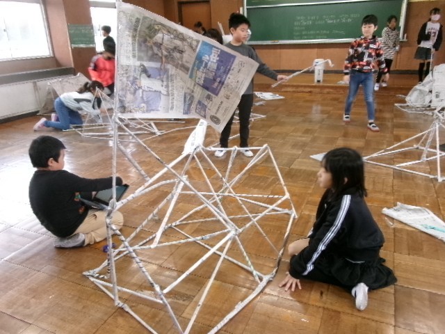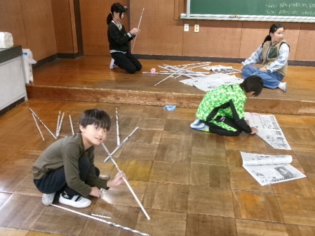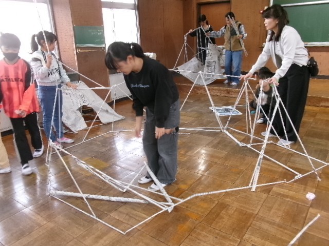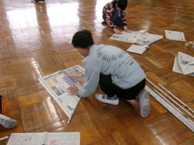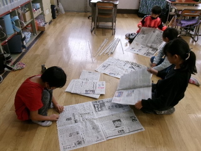 その細長く丸めた新聞紙をセロテープでつなぎ、立体物をつくります。