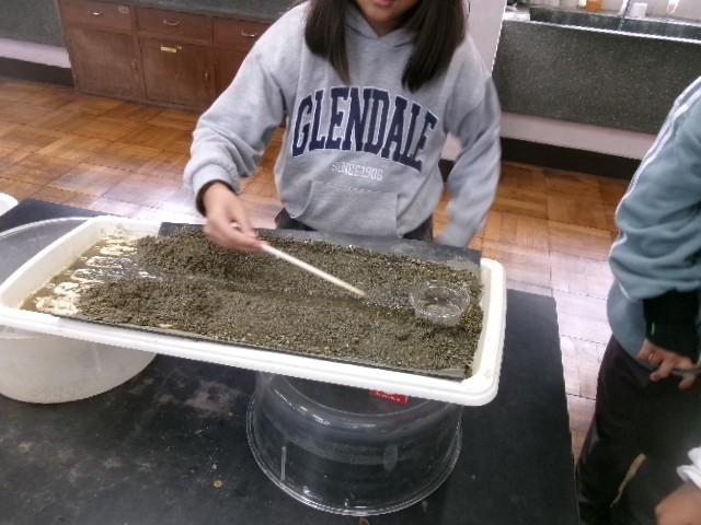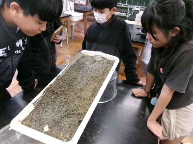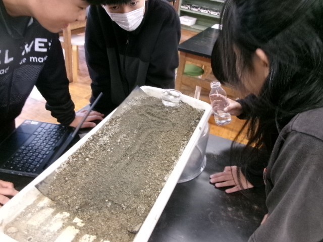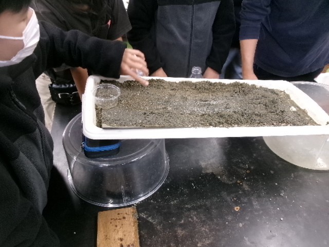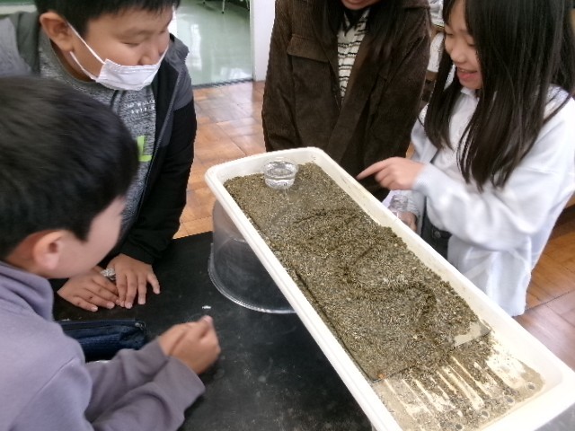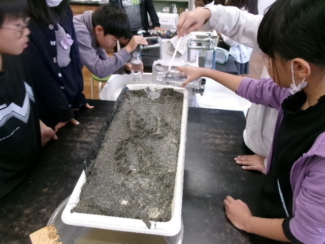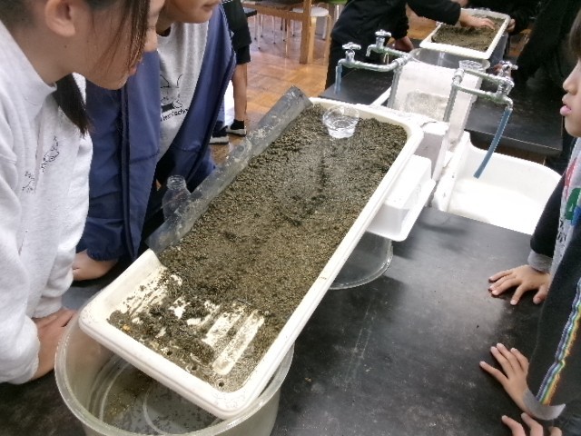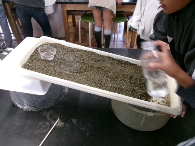 今日は、模型を使って、川に水が流れると土地がどのようになるのかを確かめてみました。