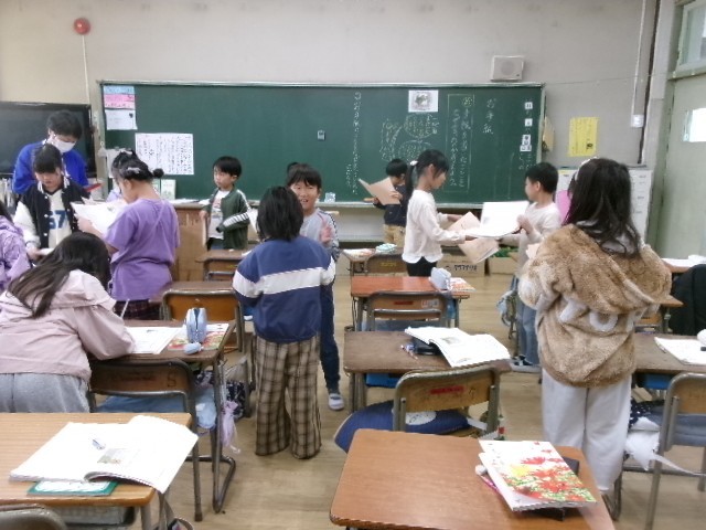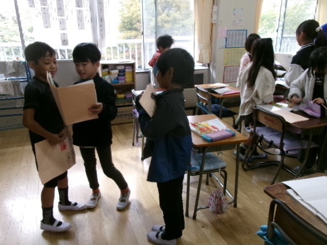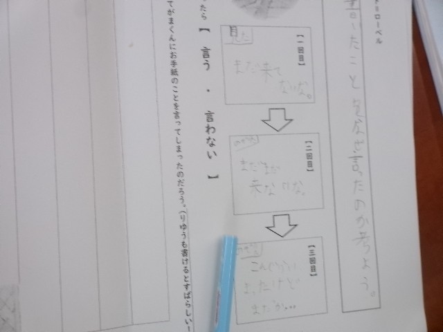「かえるくん」は郵便受けを3回も見ますが、その時の様子をその場で動作化し、「見る」と「のぞく」の違い、同じ「のぞく」でも2回目と3回目の違いを考えました。