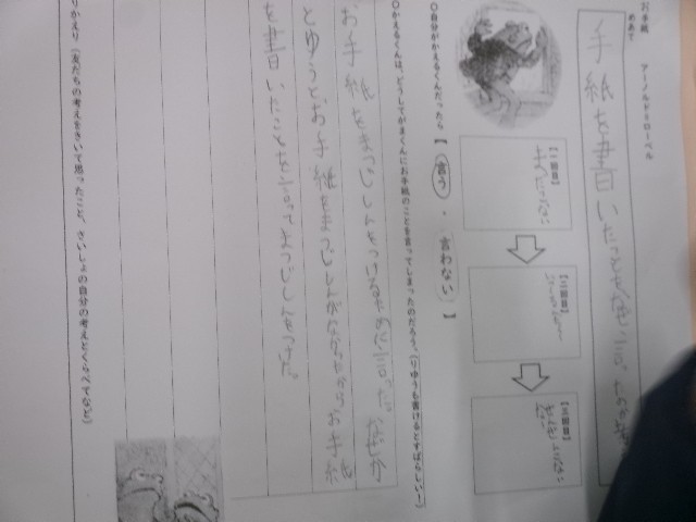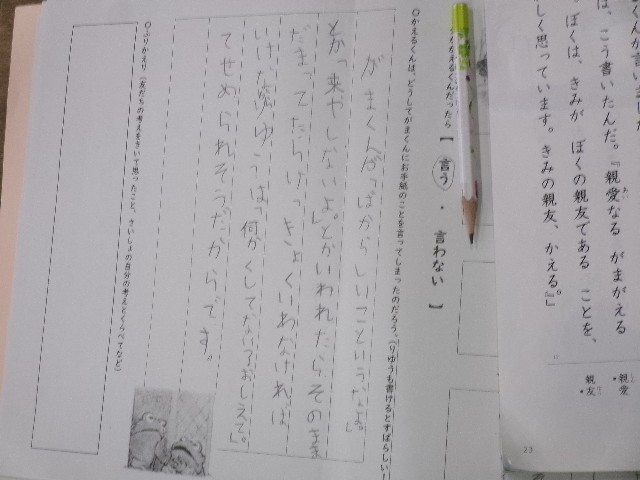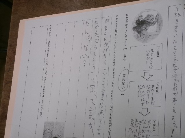 そして、「かえるくん」は、どうして「がまくん」にお手紙のことを言ってしまったのかをワークシートに書きます。