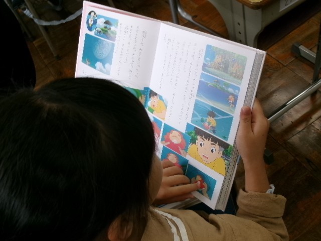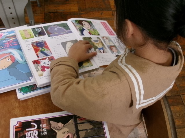 ジブリ作品が好きな子は、ジブリの本をたくさん抱えて、1冊1冊ページをめくりながら、その場面の言葉を伝えています。