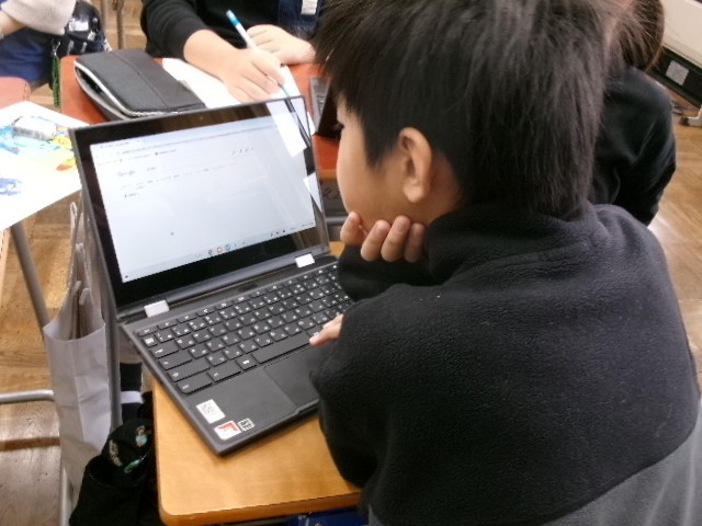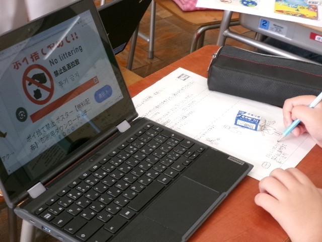 Chromebookを使って、どんなメッセージを言葉に書いたらいいか、どんなデザインを描いたらいいか、考えました。