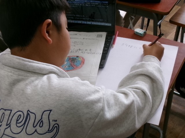 今日は、欠席の子もいたので、ポスター作りに取り組むが3人、新聞作りに取り組む子が1人です。