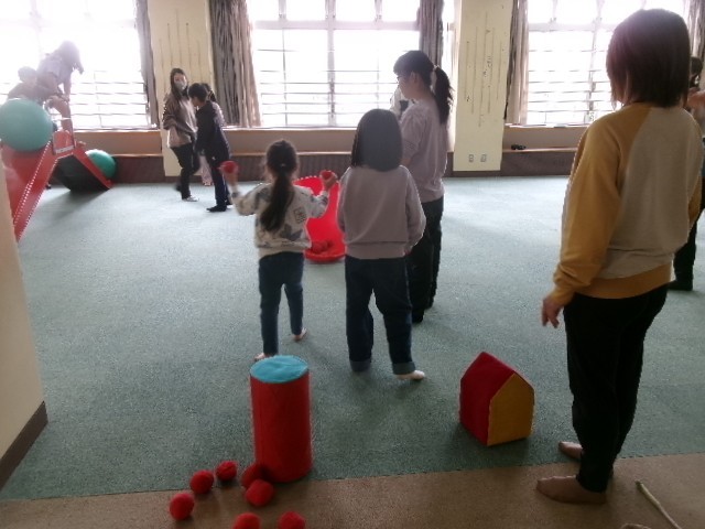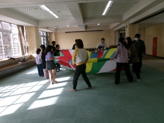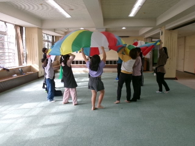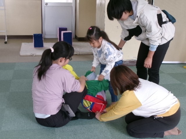 いろいろな遊具を使ってアスレチックのような場をつくり、様々な運動を楽しもうとしている子、音楽に合わせてパラシュート遊びを楽しもうとしている子、友達に読み聞かせをして楽しもうとする子…。
