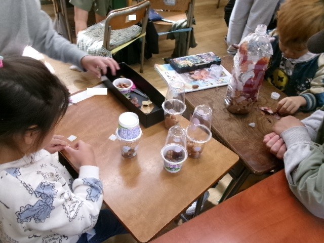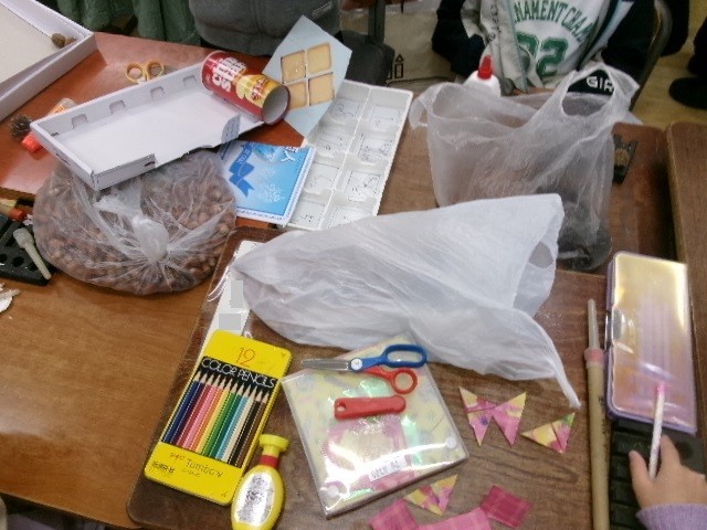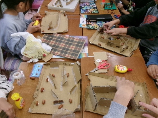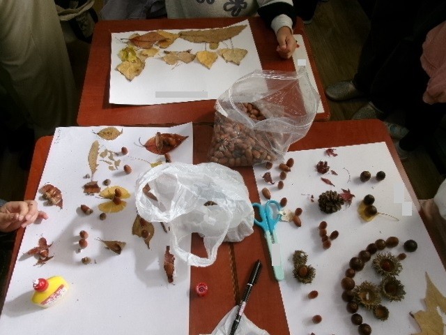1年生はこれまで、どんぐりや松ぼっくり、落ち葉など、秋らしい実や葉を集めてきました。