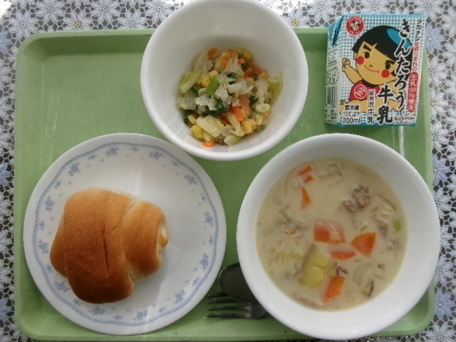 米粉ロールパン さつまいものクリームシチュー カラフルソテー 牛乳