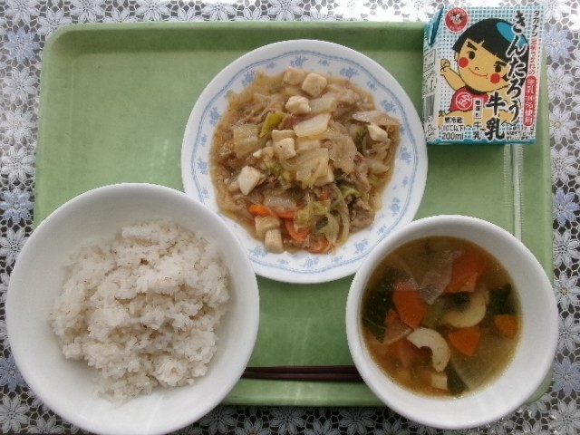 麦入りご飯 すき焼き風煮 のっぺい汁 牛乳