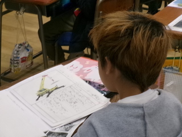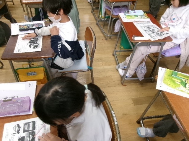 まずは「じどう車くらべ」を学習し、乗用車・バスやトラック、クレーン車などの「しごと」とその仕事をするための車の「つくり」を読み取ってきました。