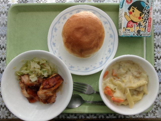 照り焼きチキンバーガー (キャベツのソテー) ペンネのクリーム煮 牛乳