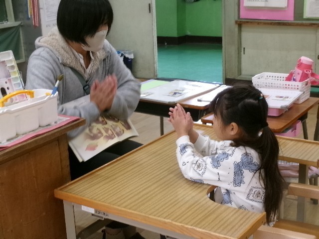 お話に合わせて体を動かすなど、興味をもってお話をきいていました。