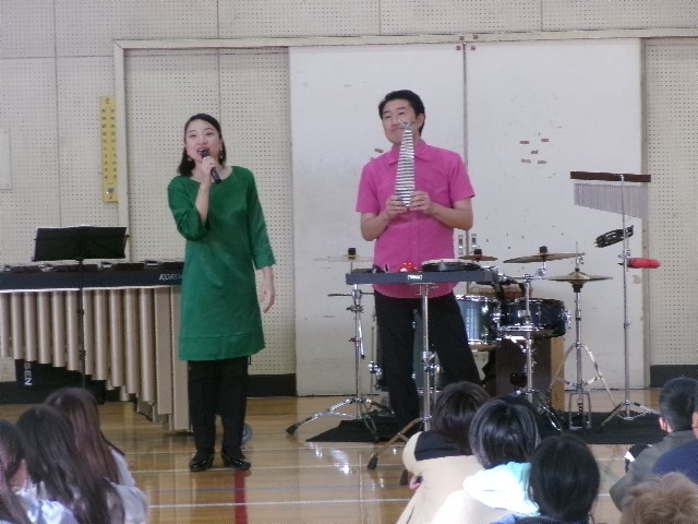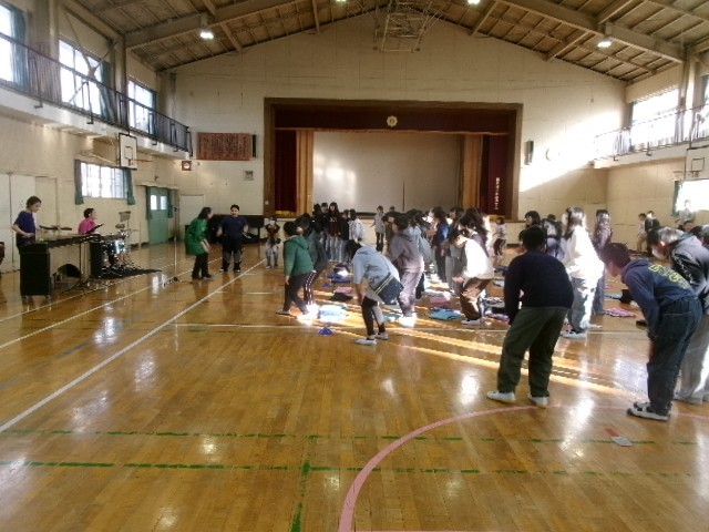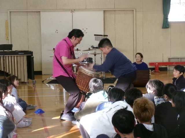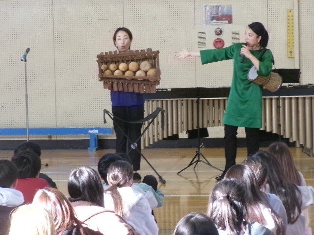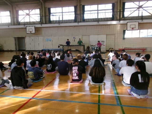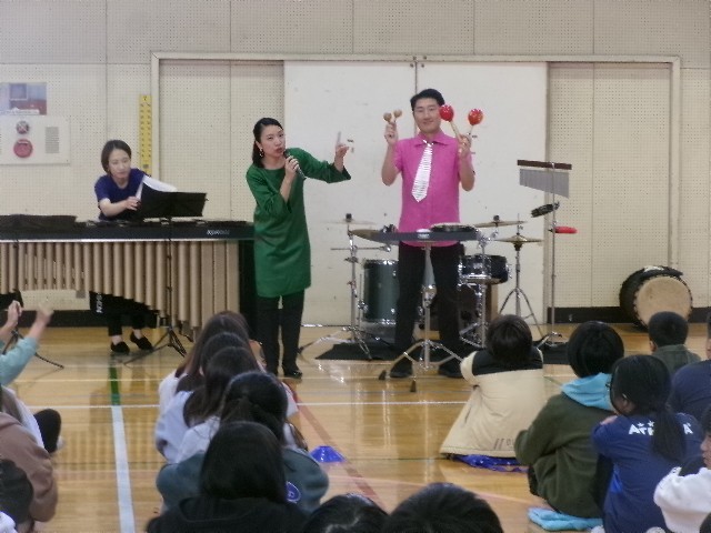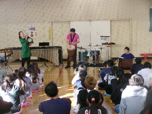 マリンバが奏でる軽快な音楽、様々な打楽器が奏でる多彩な音色とリズム、…打楽器を中心とした素敵な音楽に引き込まれ、そして、自分たちも体験させていただき、あっという間の45分間でした。