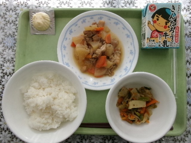 ご飯 鶏肉のさっぱり煮 はんぺんの炒め物 型抜きチーズ 牛乳