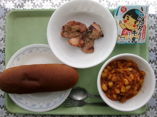 黒パン ハニーセサミチキン チリコンカン 牛乳
