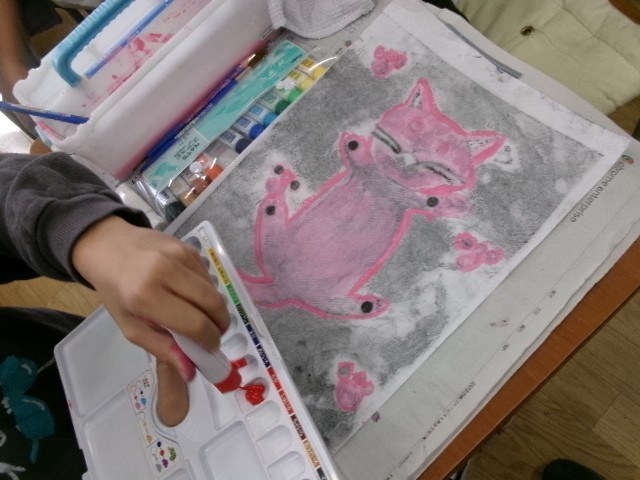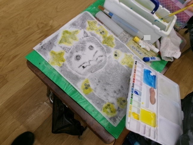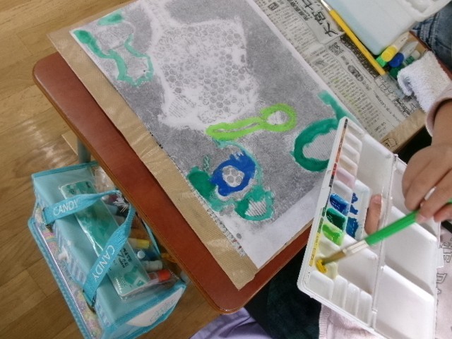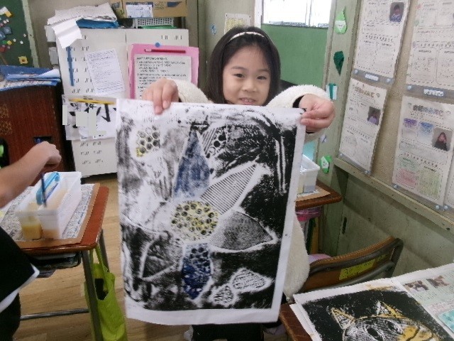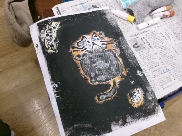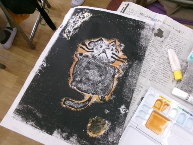 これまでの黒一色の版画とはまた違った表現を楽しんでいました。