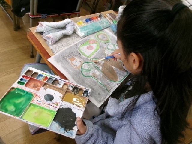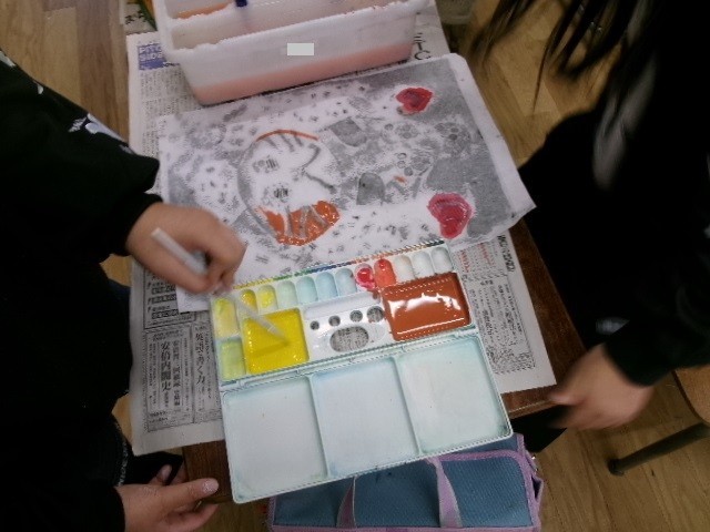 この時、水を多めにして塗ると、表側に色がにじみ出て、黒インクとの絶妙なバランスで、きれいな作品になります。