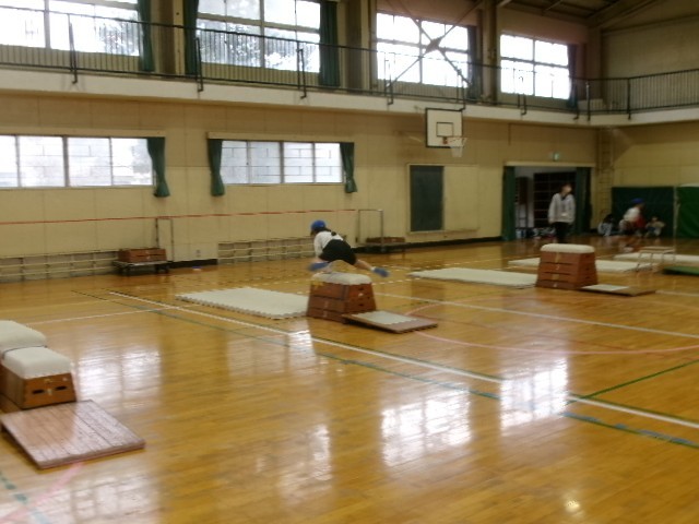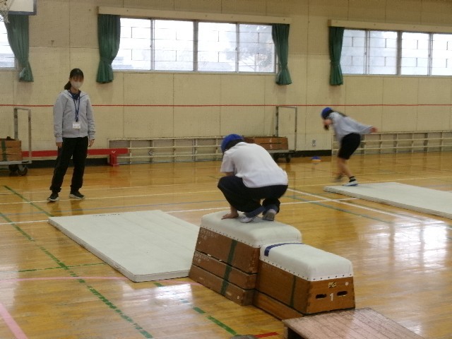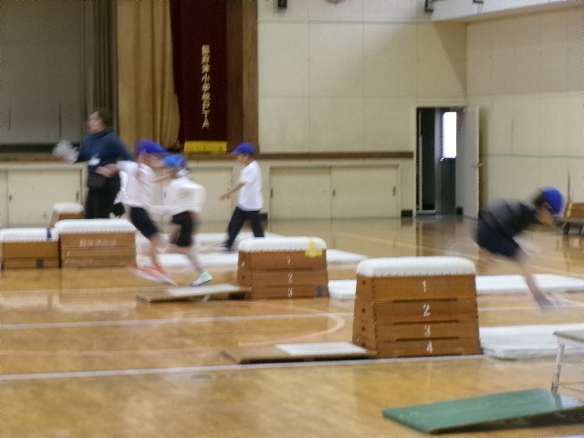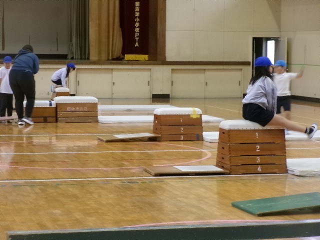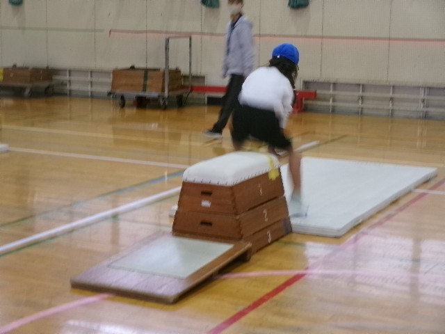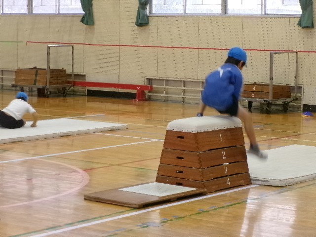 片足で踏み切って跳び箱に跳び乗ったり、ジャンプをして跳び下りたり…。