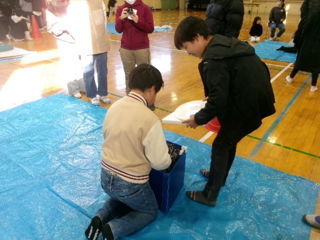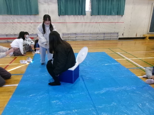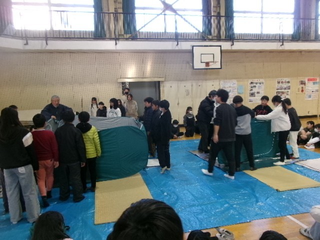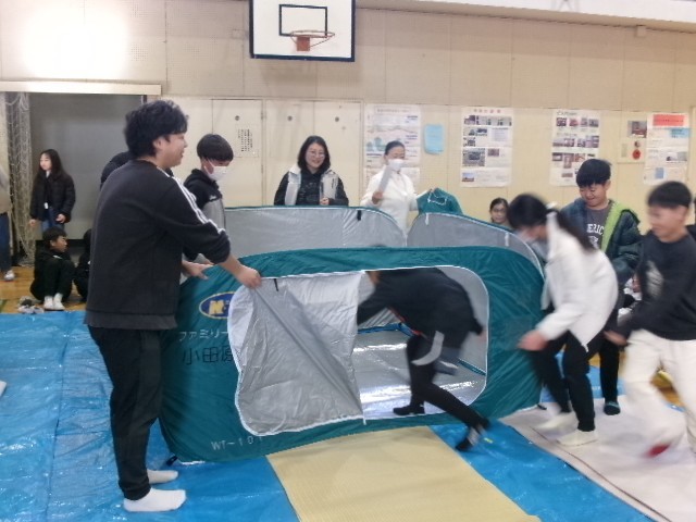 5年生は、体育館で「仮設トイレ設置訓練」と「宿泊場所設置訓練」を行いました。
