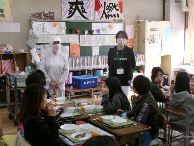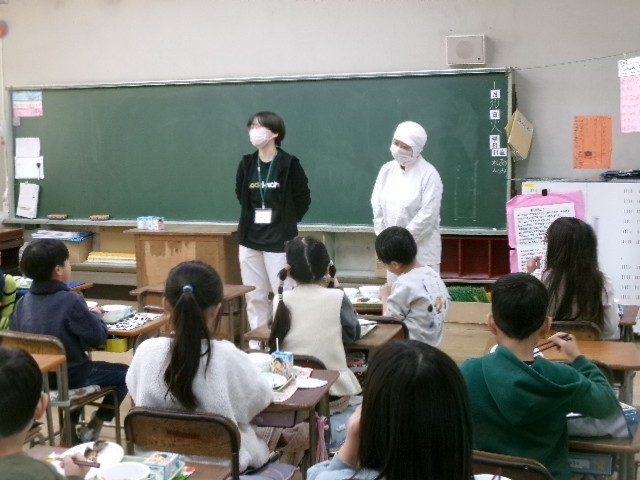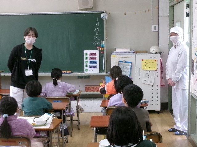 お昼の放送のお栄養士の話にもあったように、20日(火)の給食の時間、栄養士と調理員さんが一緒に教室を回りました。