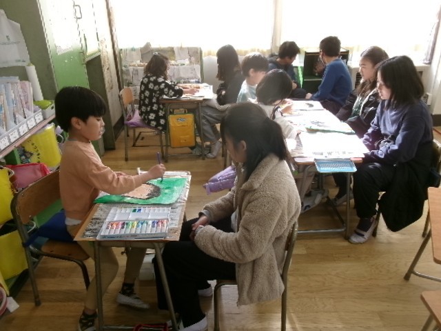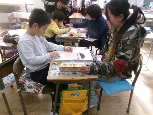 1年生の人数より6年生の人数が多いので、一人で二人の6年生の顔を描く1年生もいます。