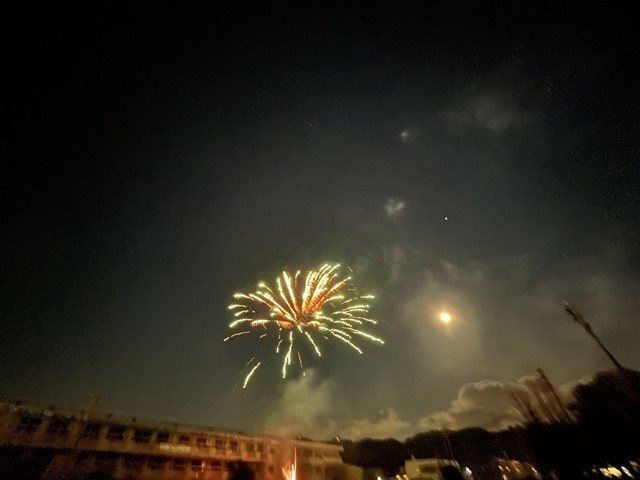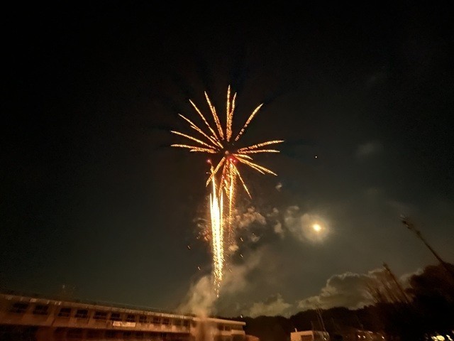 国府津の運動場から真上に上がるきれいな花火を、迫力ある音とともに、みんなで楽しみ、開校140周年をお祝いしました。