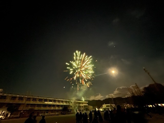 コロナ禍からのここ数年、ふれあい広場が行われていた秋に花火を打ち上げていましたが、今年度は、開校140周年ということで、開校記念日に合わせて「お祝い花火」として打ち上げていただきました。