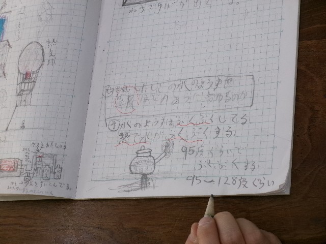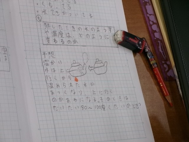 その様子を確認しながら、「熱したときの水の様子や温度は、どのように変わるのか?」について、予想を立てました。