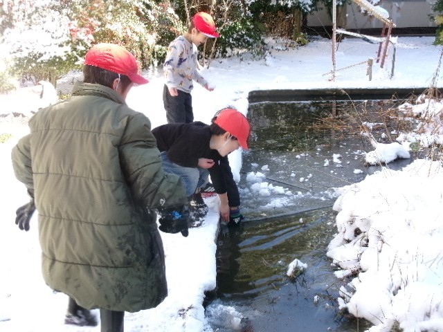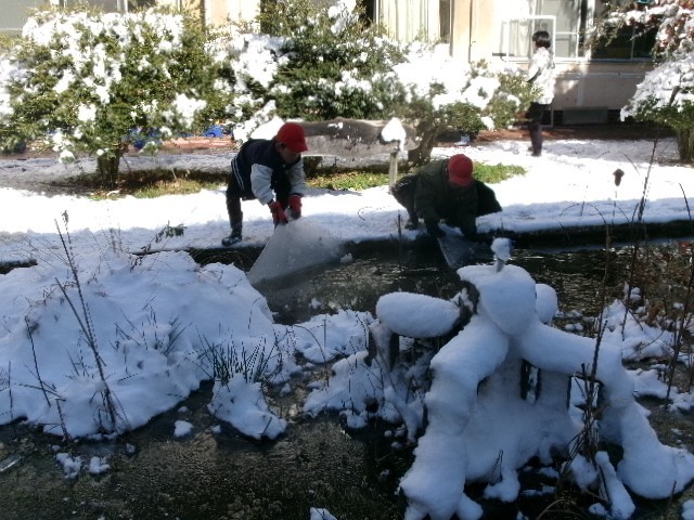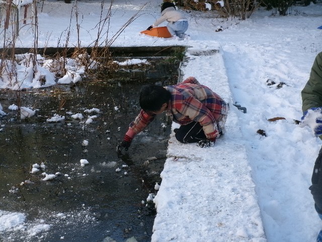 池の水面に張った分厚くて大きい氷を持ち上げて「すごい!」と喜んでいる子も…。