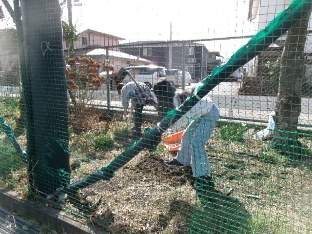 ・校庭南側の道沿いの敷地内に花を植える(まずは雑草を取って耕す!)