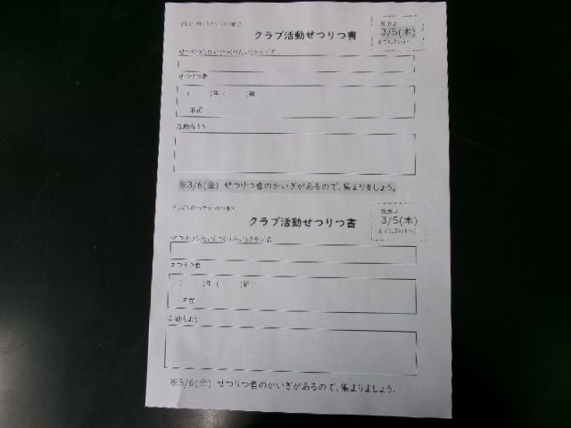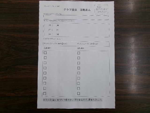 3月3日(火)~5日(木)の間に、クラブ活動の設立を希望する3~5年生は「クラブ活動設立書」に必要事項を記入し、提出。