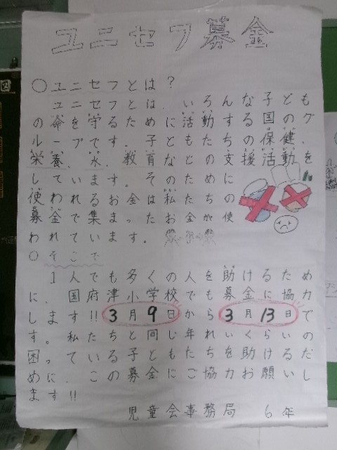 今週(9日(月)~13日(金))の朝の時間、児童会事務局の6年生が最後の活動としてユニセフ募金に取り組んでいます。