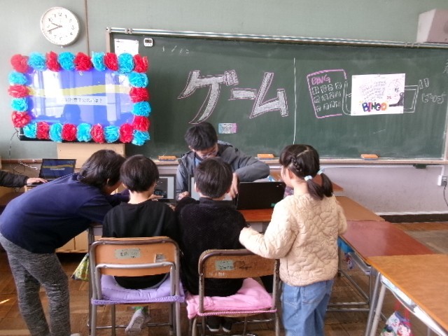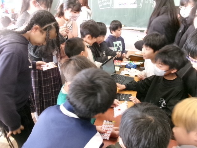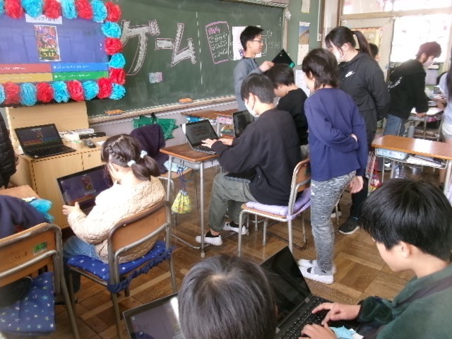 スクラッチというプログラミングソフトを使って6年生が作ったゲームも大盛況。