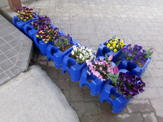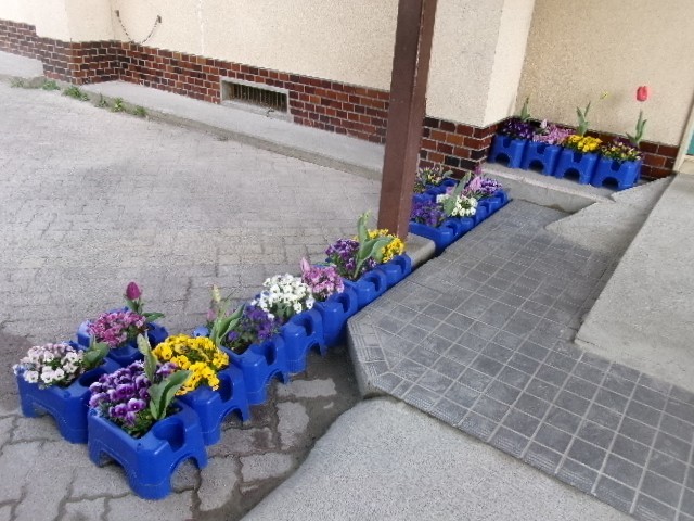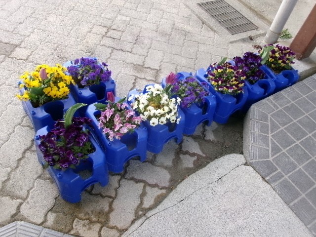植木鉢は色とりどりのビオラで埋め尽くされ、中にはチューリップの花が咲き始めている子もいます。