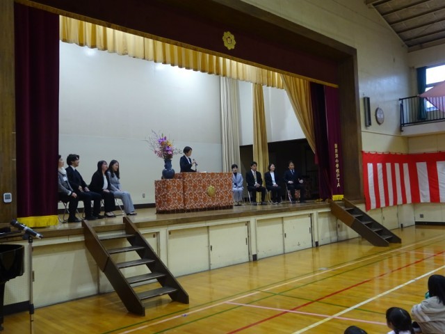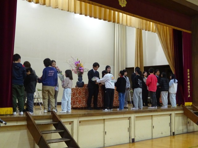 教頭から離退任する職員一人一人について紹介があった後、8名の職員に対して、児童からお別れの一言ともに、花束が贈られます。