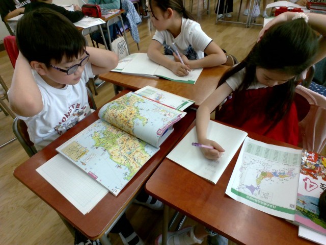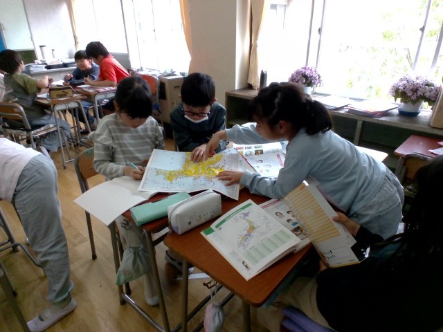 4年生の社会科では、47都道府県の名称、位置、県庁所在地を地図帳を使って学習します。また、特徴的な産業や名所を交えつつ、漢字での読み書きも定着させ、5年生の地理学習へとつなげます。