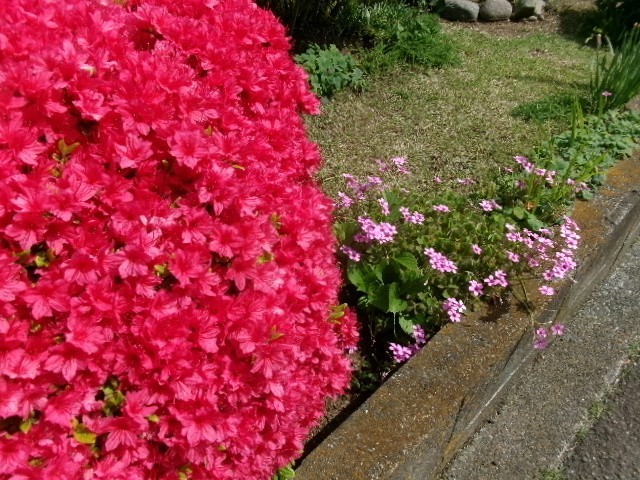 黄色コースには、鮮やかな色のつつじが咲き始め、「花がいっぱい咲いてるねー。」