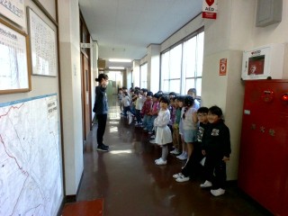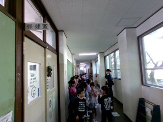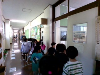 生活科では、校舎の南館・北館を探検しました。担任が先導し、事務室、校長室、職員室、保健室などの説明を聞きました。