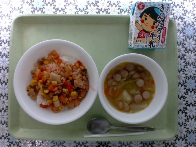 まぜまぜチキンライス 野菜コンソメスープ 牛乳