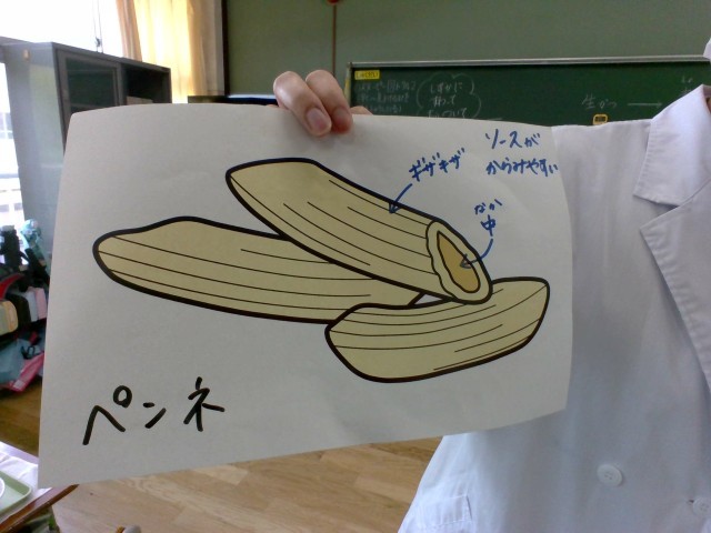 カードを見せながら、「ペンネは筒状のパスタで、表面がギザギザしていてソースがからみやすいつくりになっている」