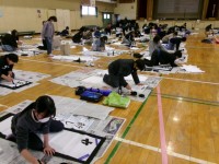 新春の授業2日目の今日は、3年生と4年生が体育館で書き初めを行いました。
