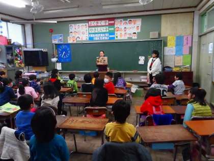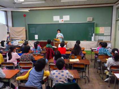 1年生では1組が「めっきらもっきら どおんどん」「むかしむかしのひなあられ」2組が「おおさむこさむ」「てじな」3組が「ちいさなヒッポ」「「おばあちゃんのたんじょうび」でした。どのクラスも静かに聞くことができました。