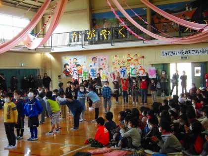 1年生は身体表現で気持ちを伝えました。心と体が元気になる「ふわふわダンス」です。6年生の目の前で全員で踊りました。掃除や怪我の時などのお礼のことばも伝えました。